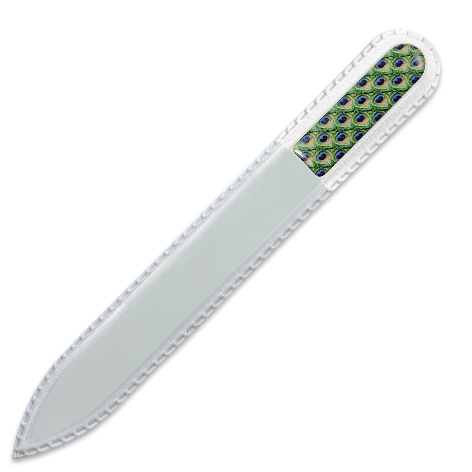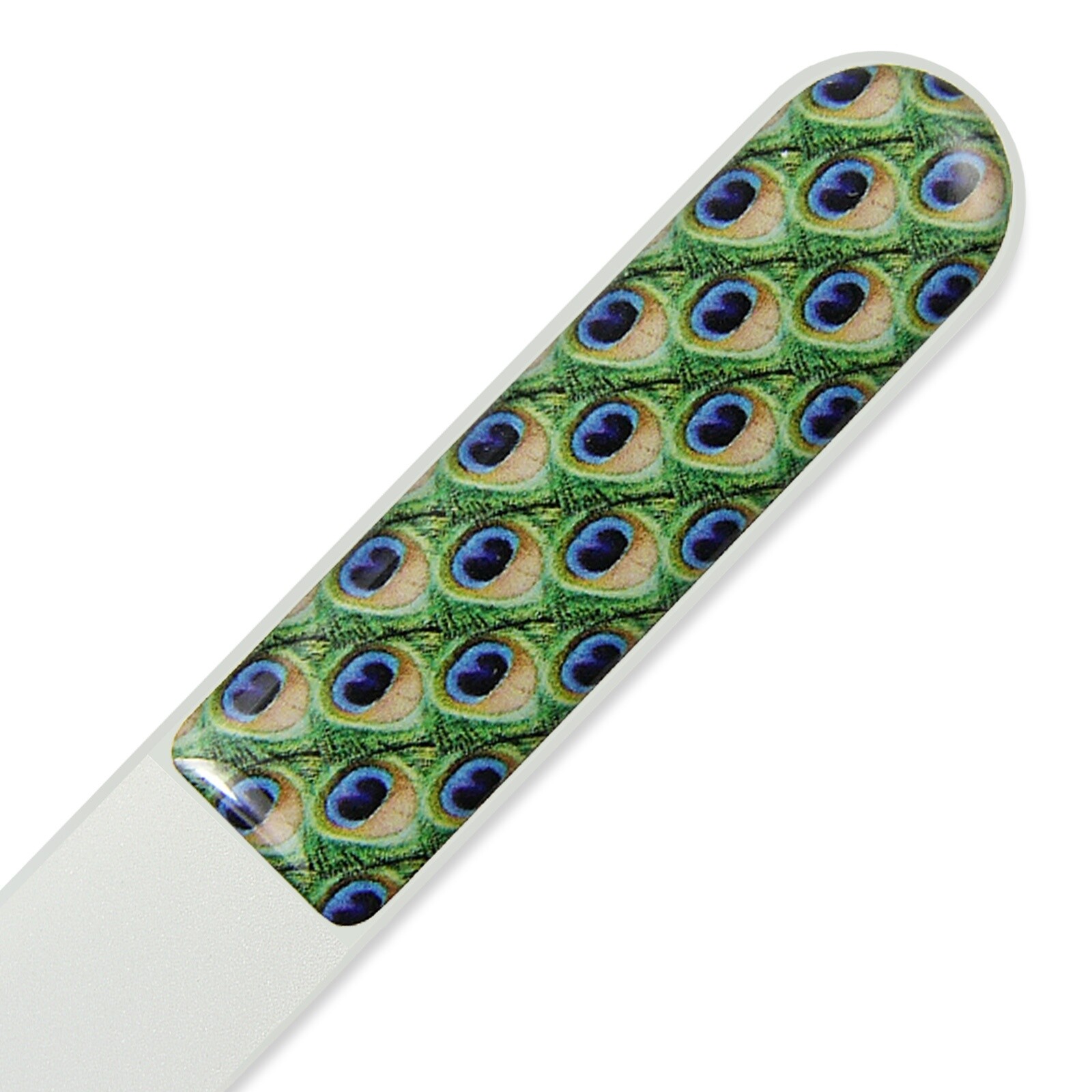 Lima per unghie in vetro dalla Repubblica Ceca "Peacock" con un adesivo 3D colorato. Lunghezza della lima 135 mm.