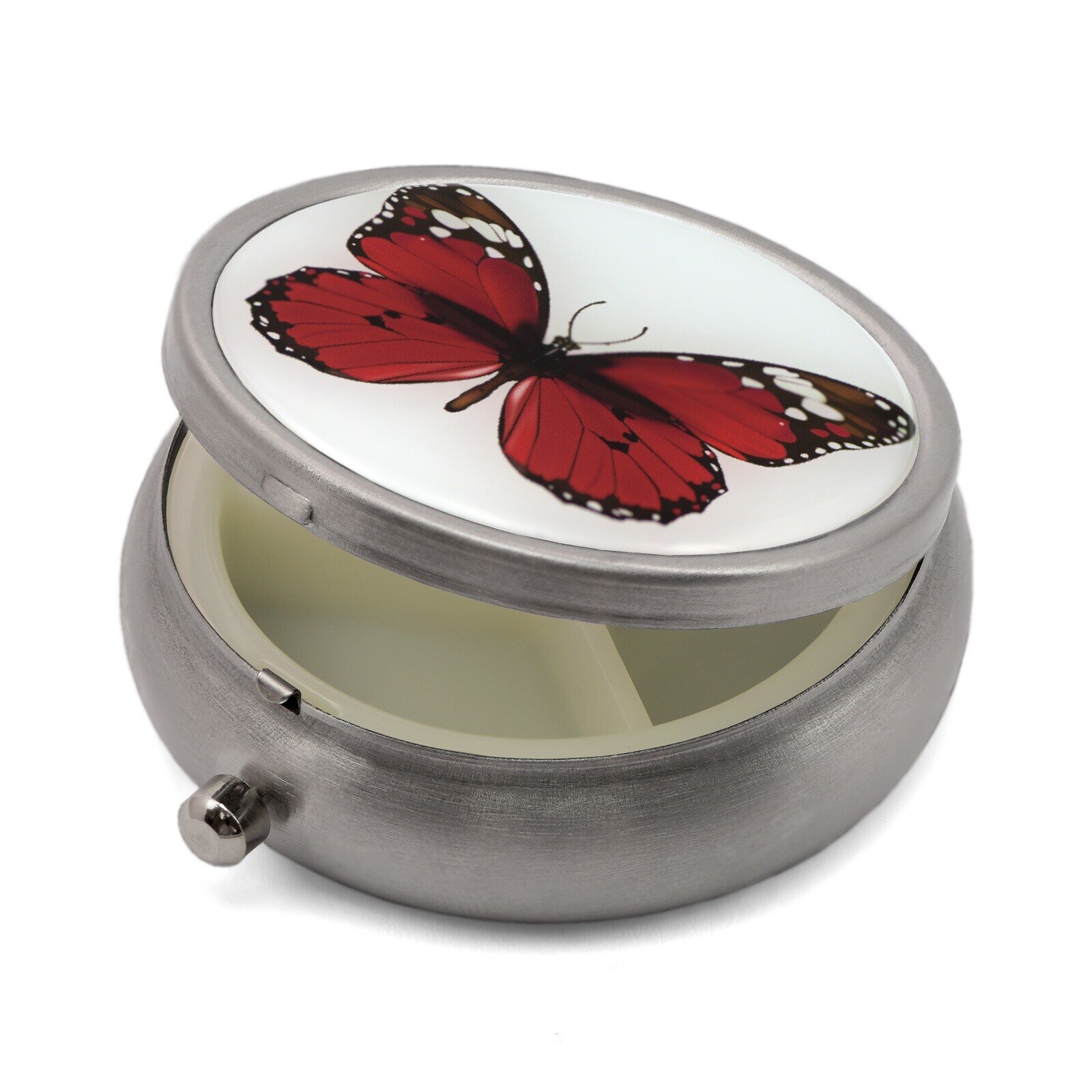 Portapillole con un design moderno ed elegante con stampa a farfalla. Questo portapillole in acciaio inossidabile argento è pulito e perfettamente proporzionato per la borsa, una pochette da sera o una borsetta.