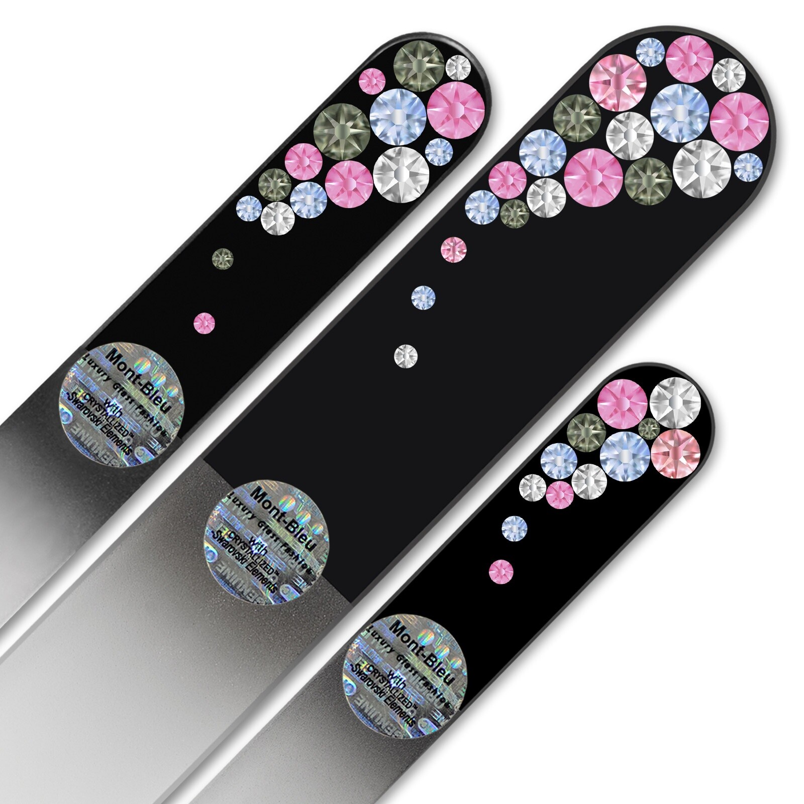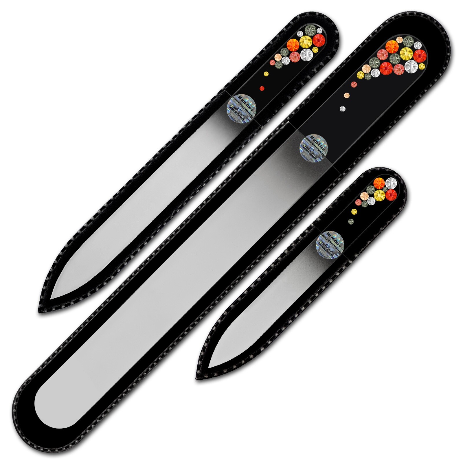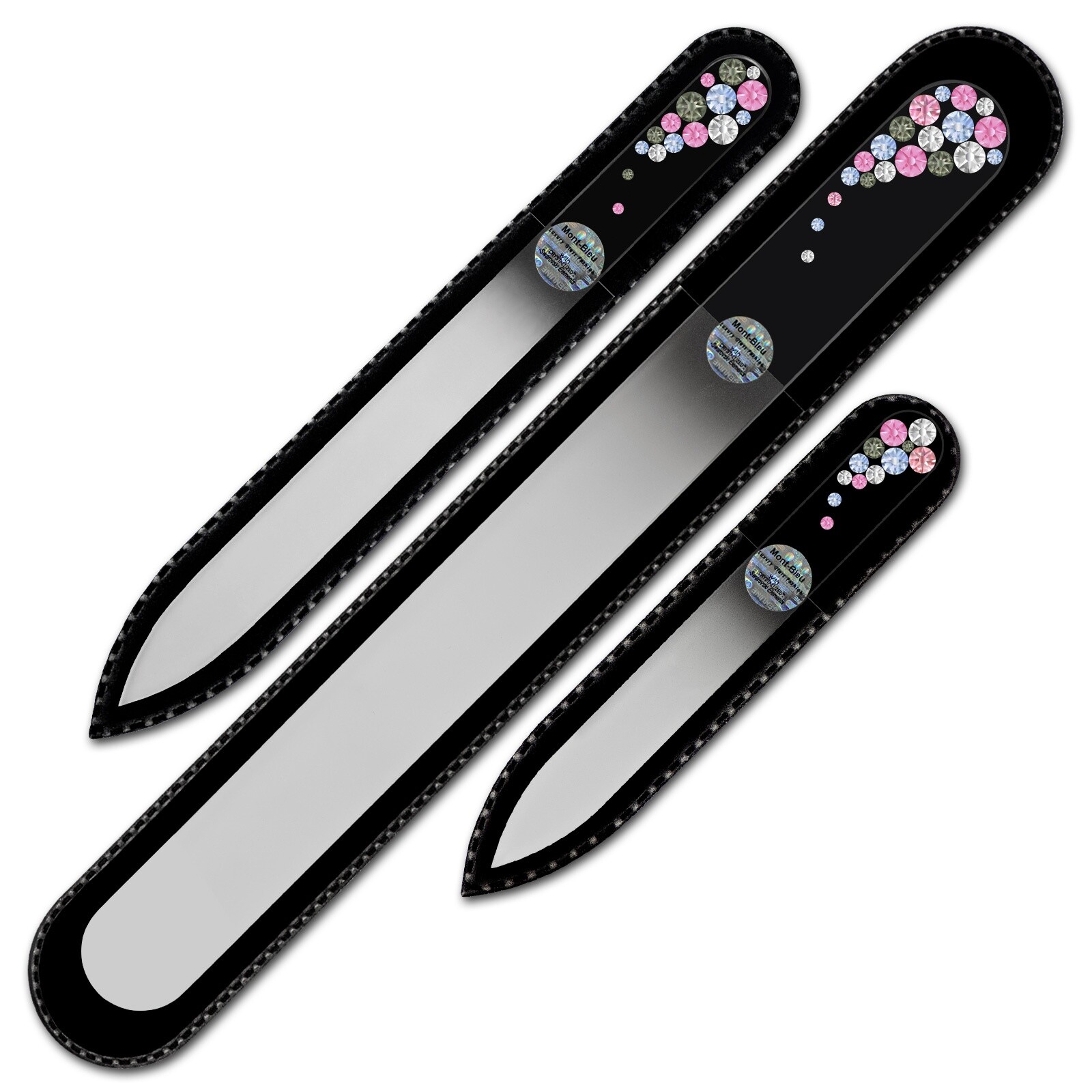 Стеклянные пилочки для ногтей изготовлены из Чешского закаленного стекла, на пилящую поверхность пилочек распространяется пожизненная гарантия. Все пилочки поставляют в бархатном чехле.