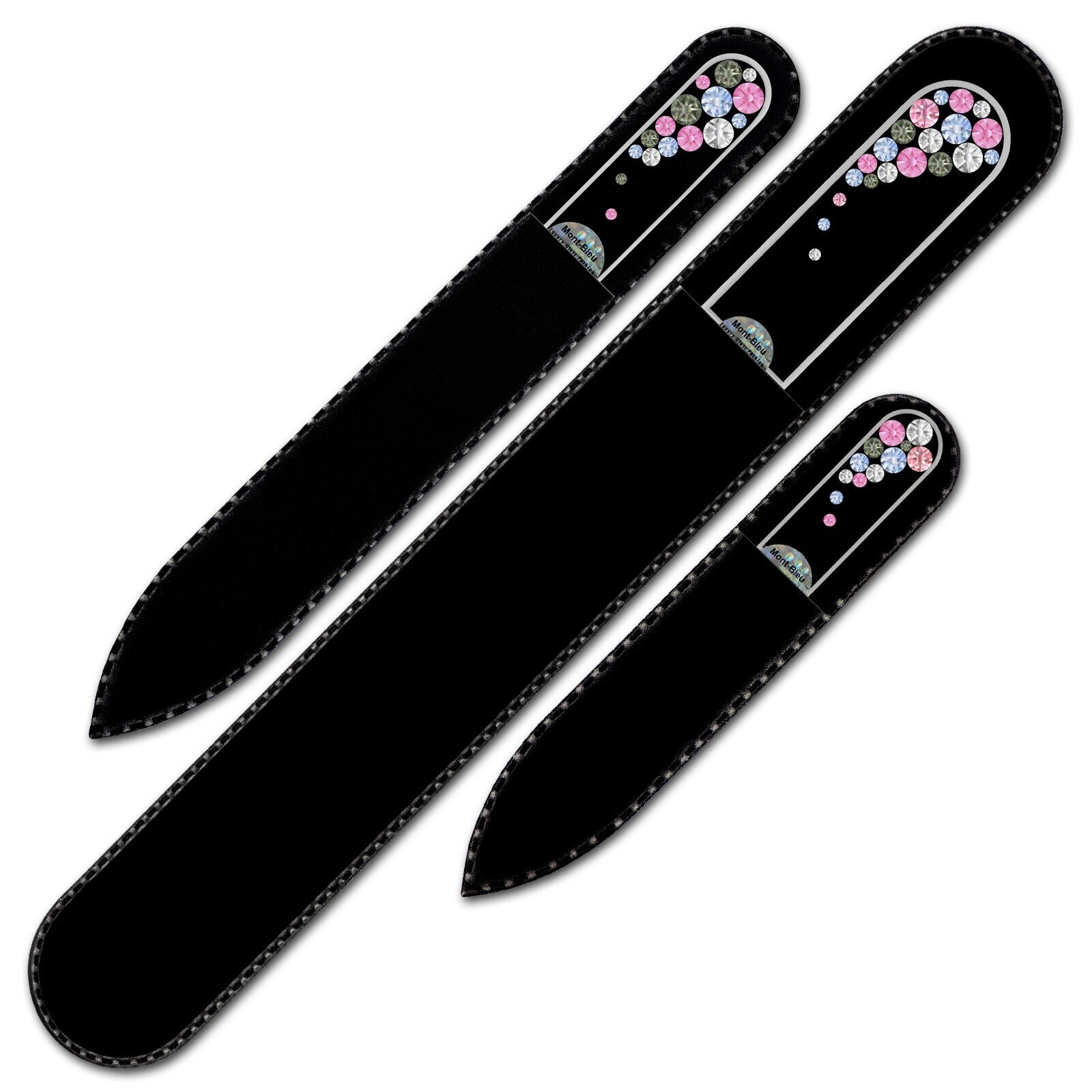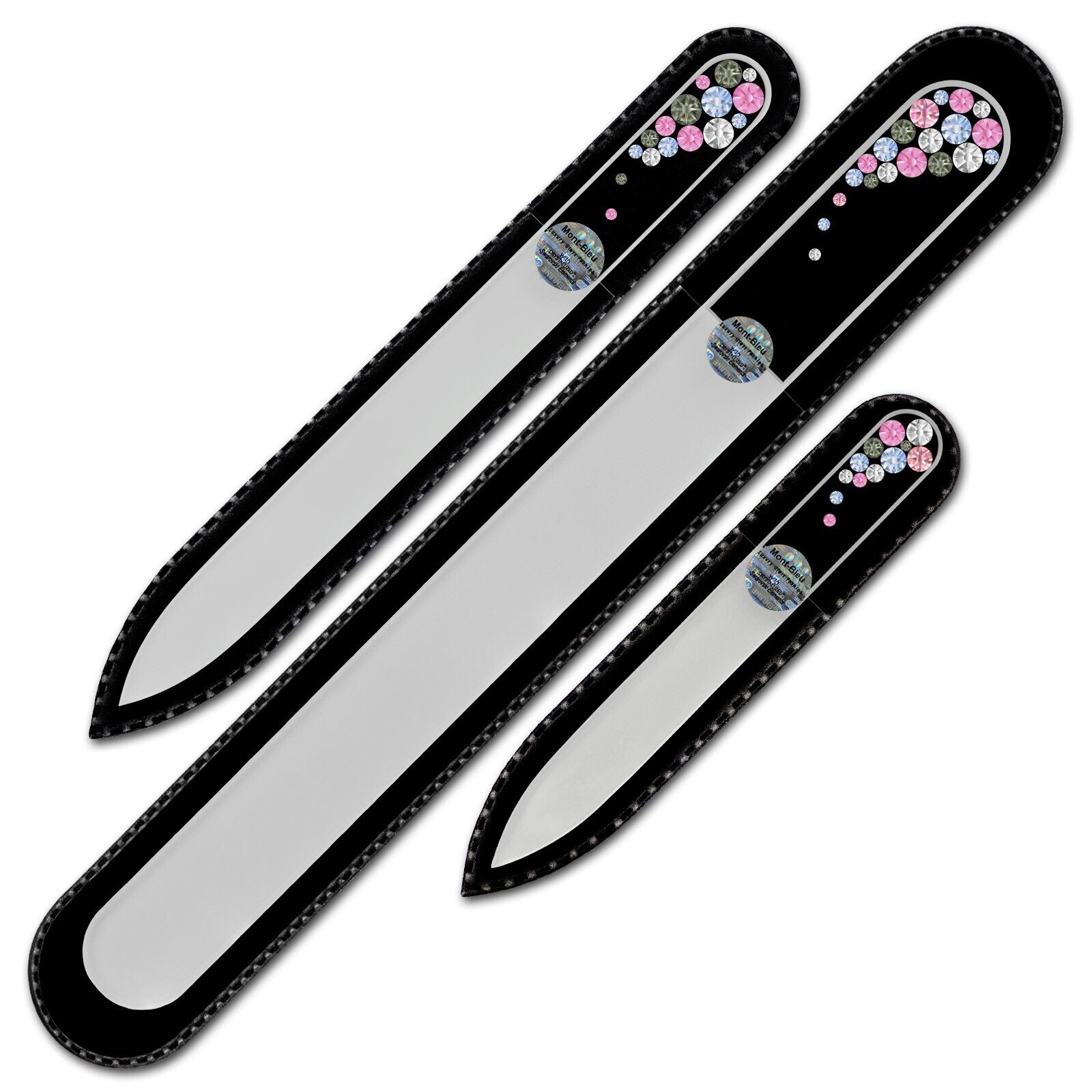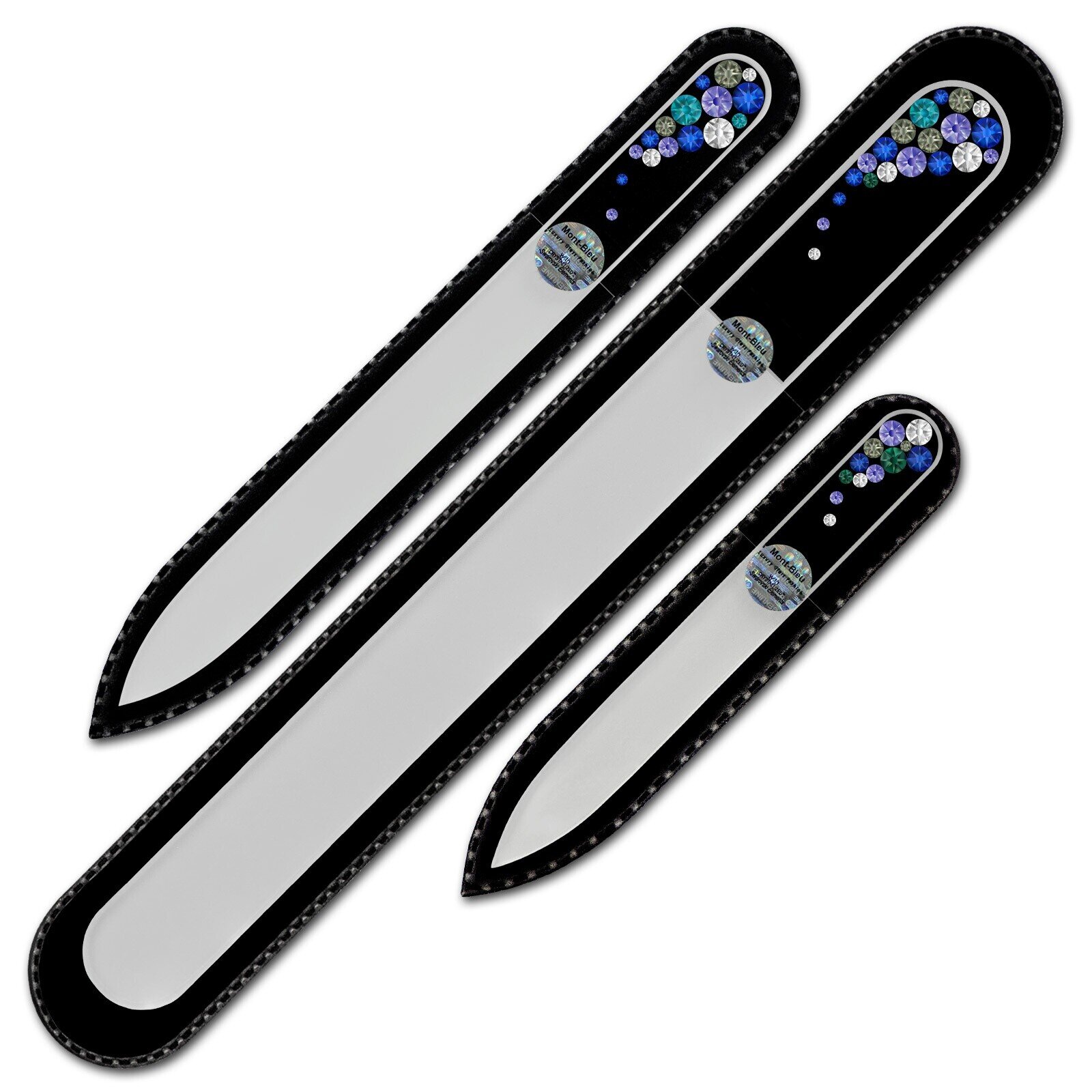 Стеклянные пилочки для ногтей изготовлены из Чешского закаленного стекла, на пилящую поверхность пилочек распространяется пожизненная гарантия. Все пилочки поставляют в бархатном чехле.
