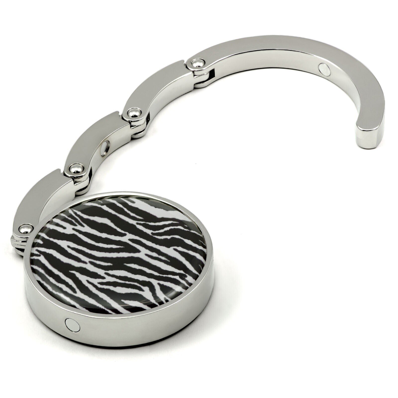 Colgador de Bolso plegable con Estampado de Piel de Cebra. Pequeño y portátil, este útil compañero cabrá fácilmente en cualquier monedero