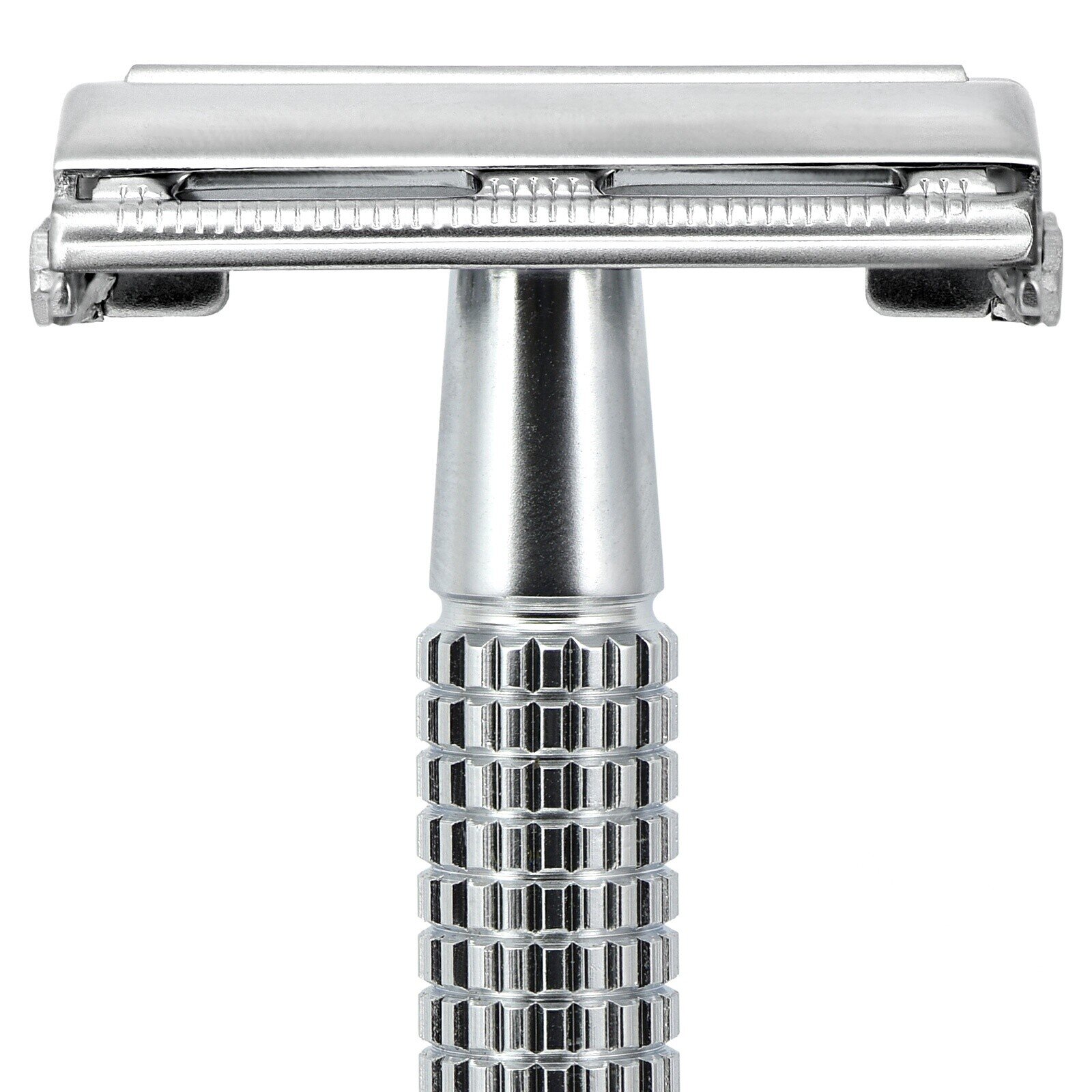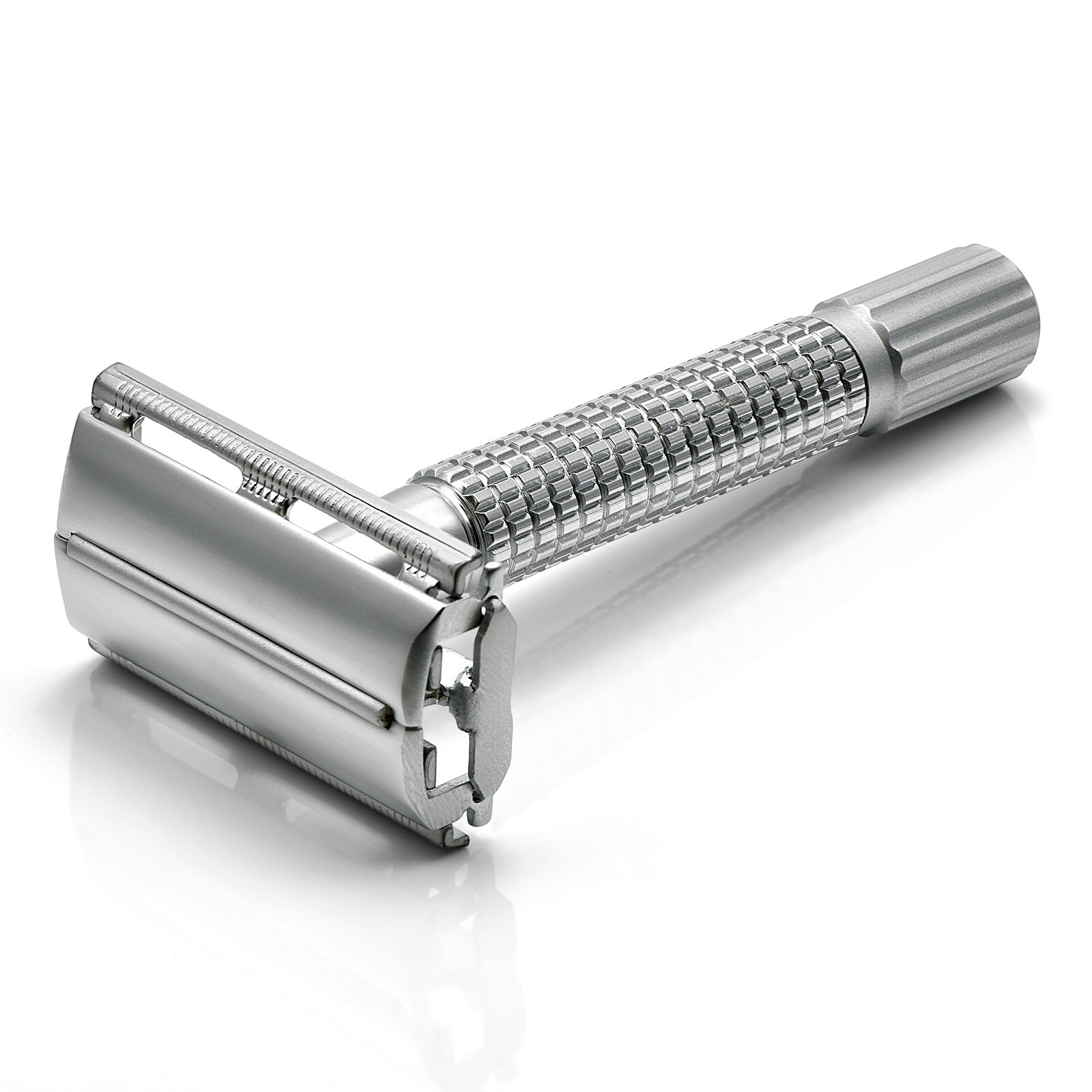 Avec sa construction en laiton chromé et sa finition en chrome brillant, c'est un véritable classique qui ne vieillira jamais. La poignée s'évase, facilitant la prise en main et offrant un rasage précis, tandis que le mécanisme sécurisé de rotation pour ouvrir signifie que vous pouvez changer les lames en quelques secondes. Longueur du manche 80 mm. Vous pouvez être sûr d'une performance premium.
