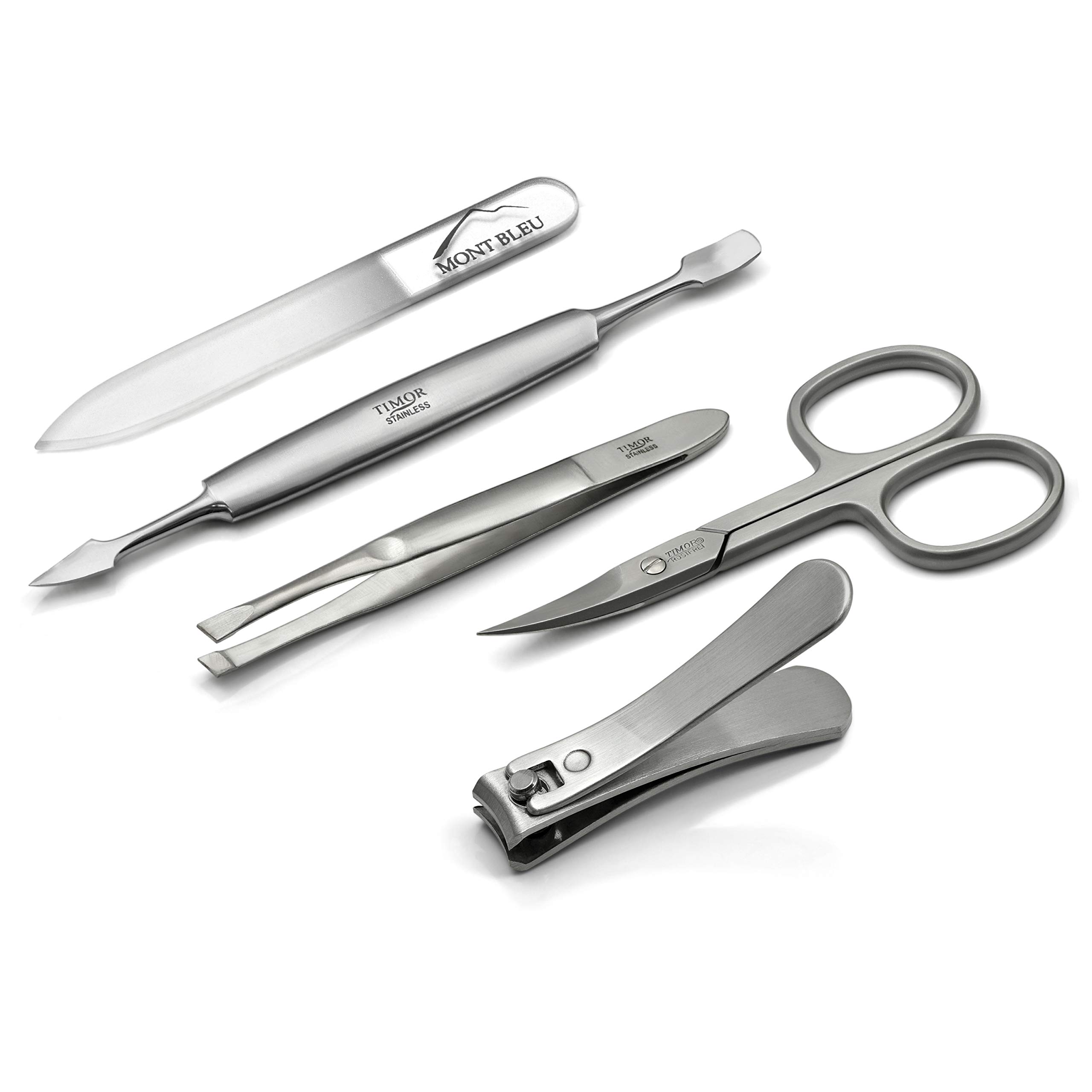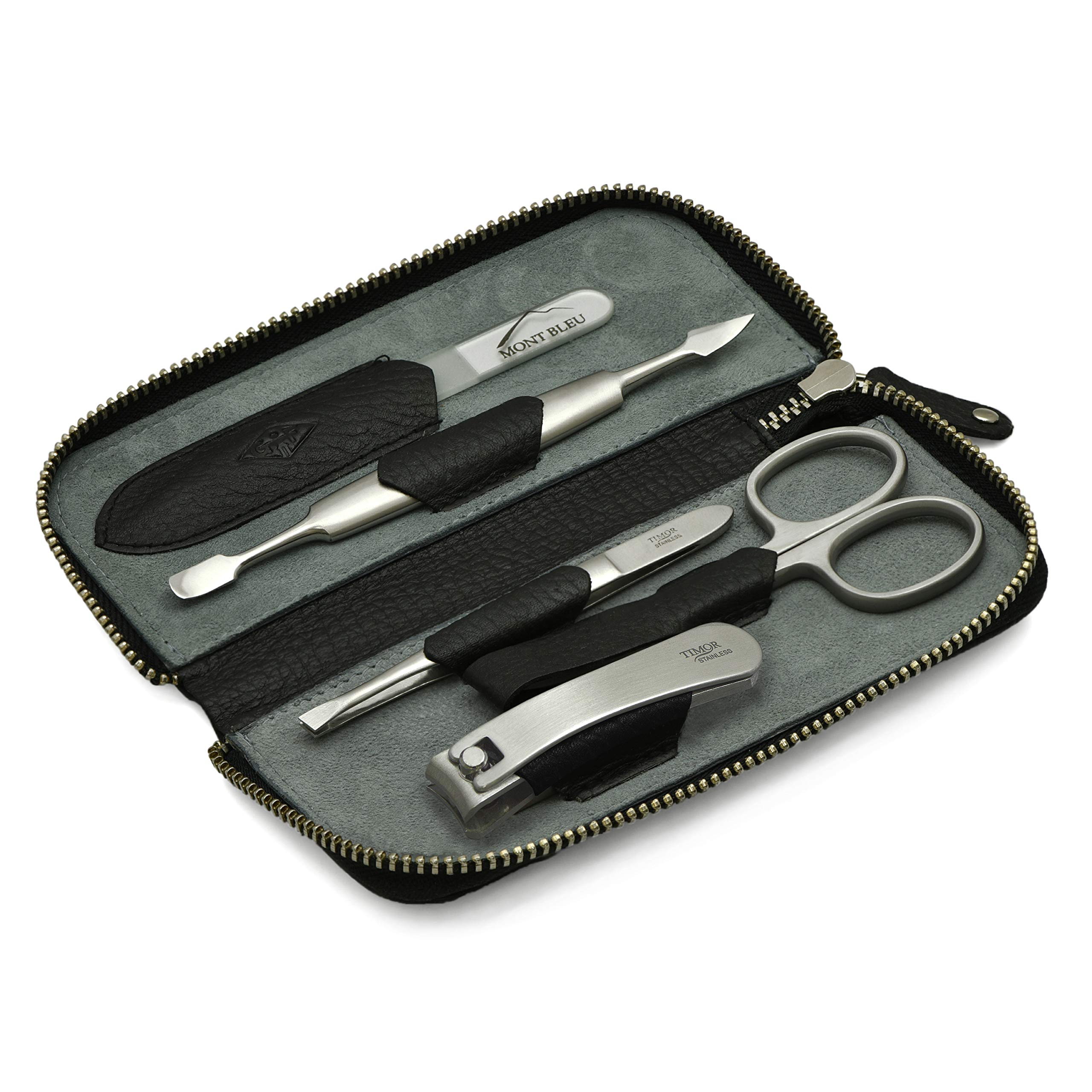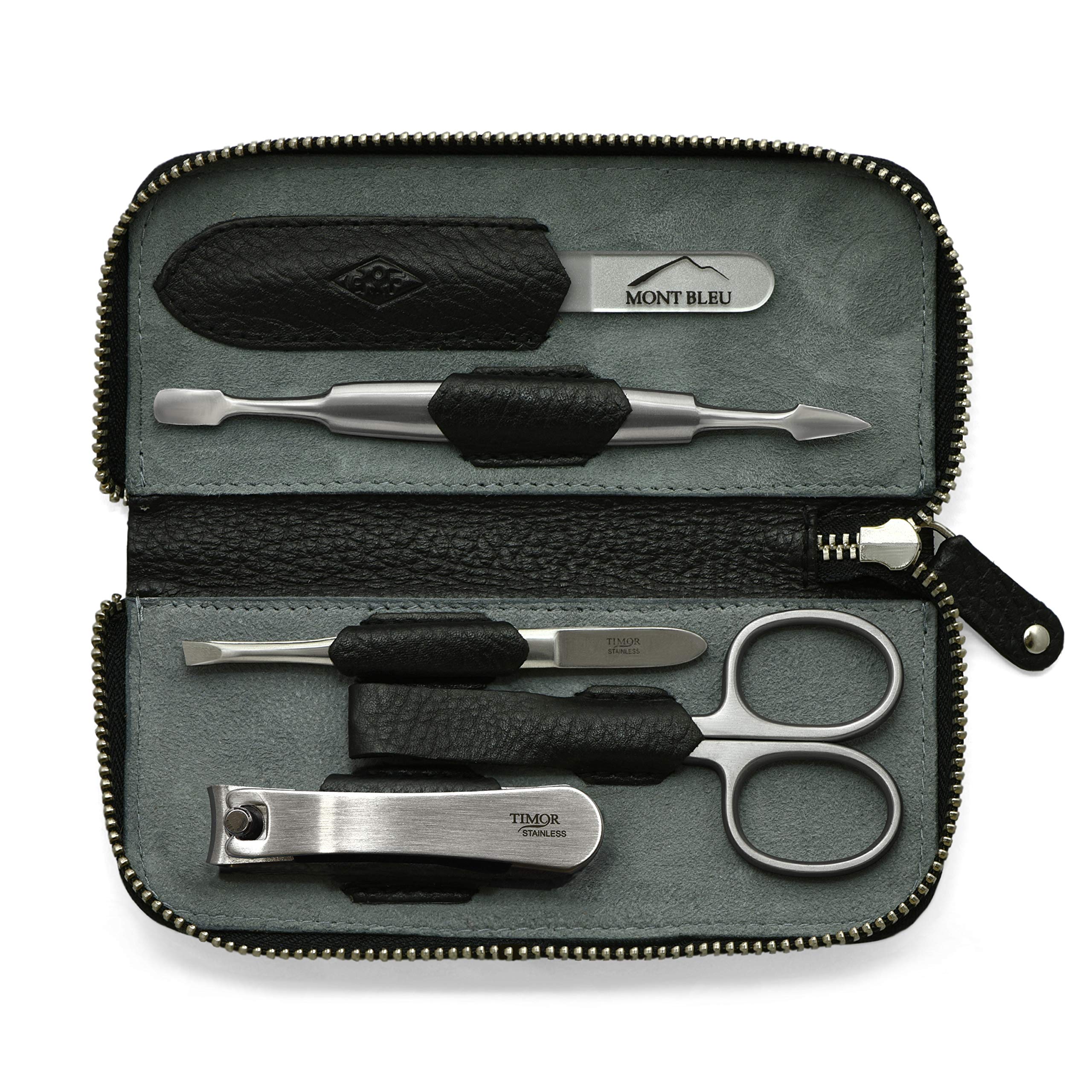 Set de manucure en cuir avec ciseaux à ongles, poussoir à cuticules 2 en 1 et nettoyant pour ongles, coupe-ongles, pince à épiler et lime à ongles en verre Mont Bleu. La lime à ongles en verre est fabriquée en République tchèque.